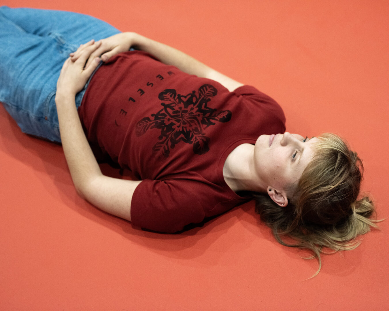 Przy pracy nad spektaklem wsłuchiwaliśmy się w opowieści zaproszonych do rozmowy osób, a przede wszystkim podążaliśmy ich ścieżkami. Było dla nas jasne, że doświadczenia sprzeciwu nie są tylko do opowiedzenia i nie zapisują się wyłącznie w słowach. Może nawet bardziej zapisują się w ciele — że to zwłaszcza nieświadome gesty i echa sytuacji, gdy ciało nie chciało nas słuchać, mogą być nośnikiem opowieści. W takim myśleniu ważną inspiracją jest projekt „Motus Mori: Museum”, który Katja Heitmann wraz z zespołem zaprezentowała podczas 26. Międzynarodowych Spotkań Teatrów Tańca w Lublinie1. Nasz spektakl nie jest co prawda choreograficzny, ale współdzielimy przekonanie, że nie tylko w słowach i ich przekazie zapisywana jest historia. Właśnie dlatego „Gesty oporu” można odbierać w sposób charakterystyczny dla teatru, jak i patrzeć na nie raczej jak na muzealną wystawę. Zapraszamy do przysiadania, dawania sobie chwili przerwy, ale też aktywnego podążania za aktorką.