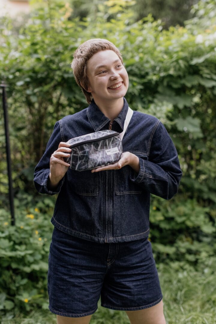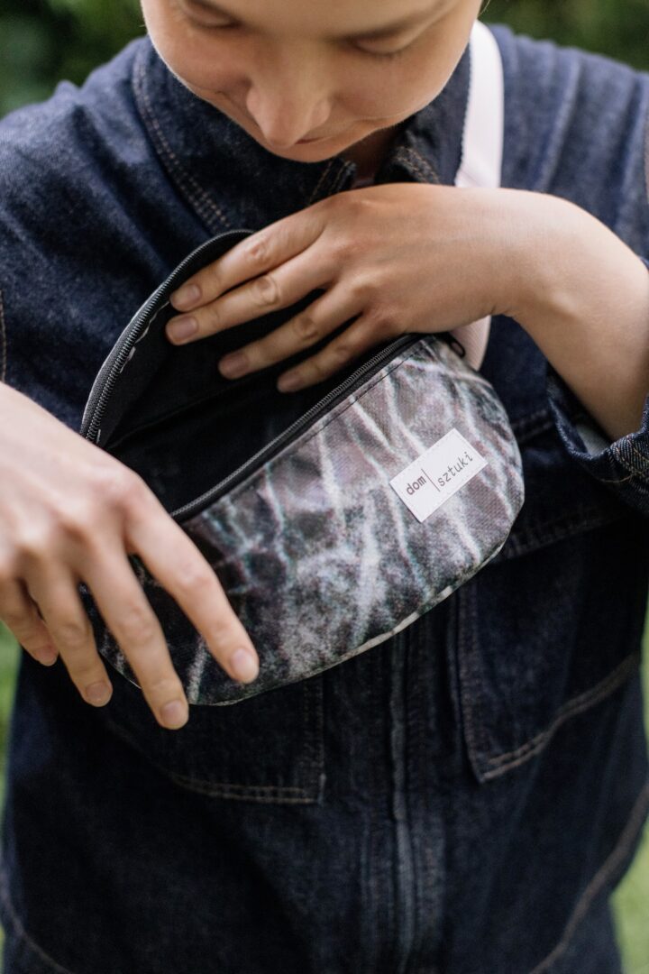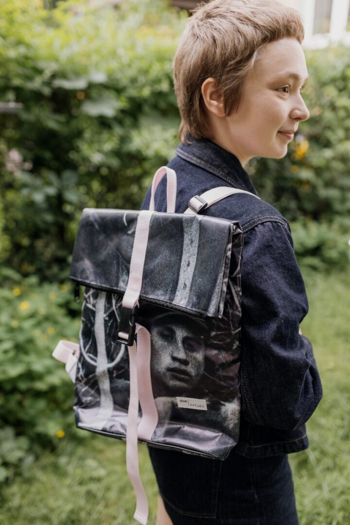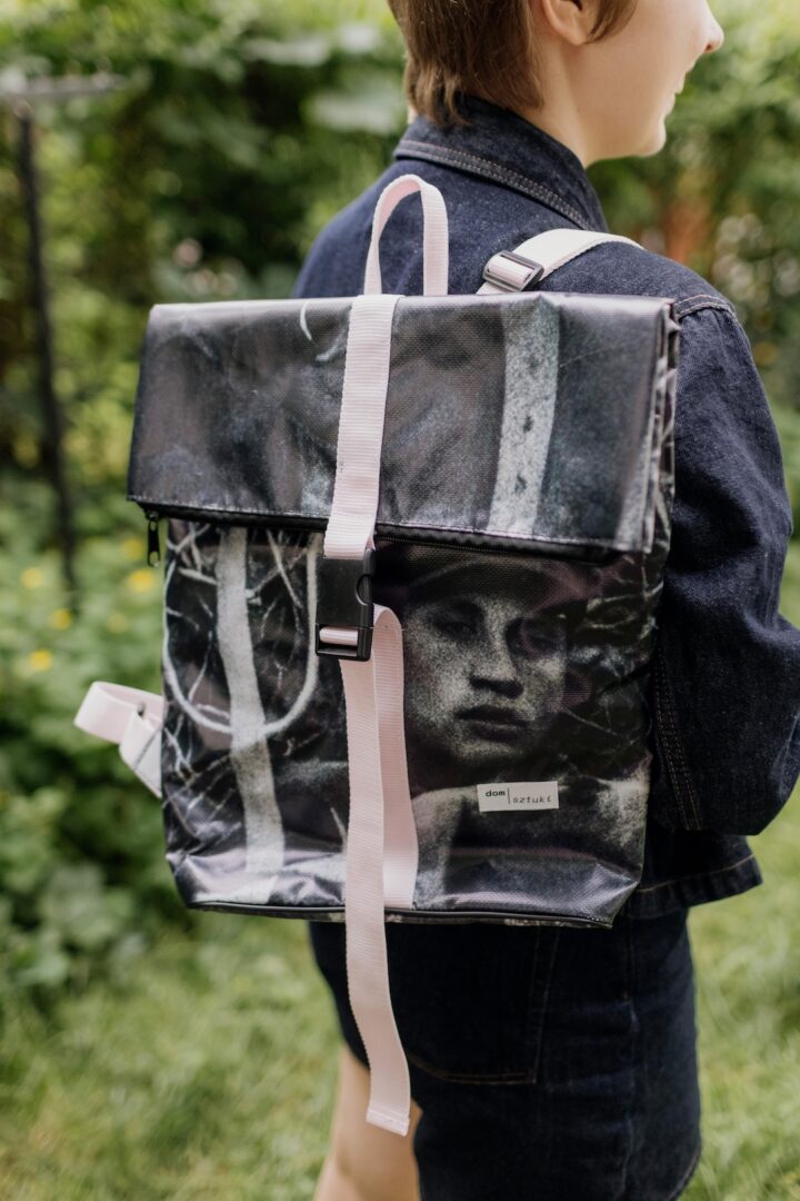 Nerki i plecaki powstały z odzysku w pracowni Trashki, więc każda jest nieco inna. Widać na nich fragmenty fotografii związanych z grochowską historią. Polska marka, lokalny kontekst, a do tego dorzucamy jeszcze pocztówkę z podziękowaniem za wspieranie oddolnych działań i niezależnej kultury.